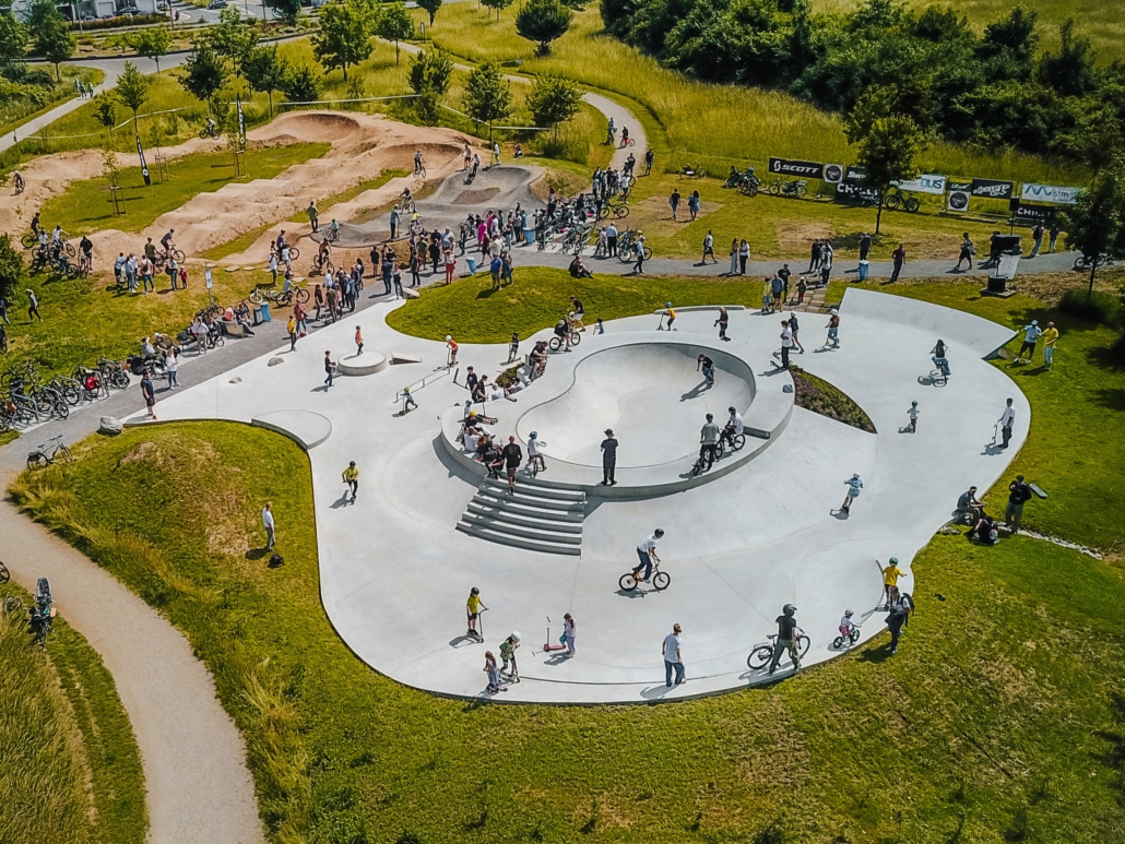 Heute rollen Skateboards und Fahrräder durch die Anlage, die fast die Größe eines Fußballfeldes hat und Bowl, Pumptrack und Trails vereint.